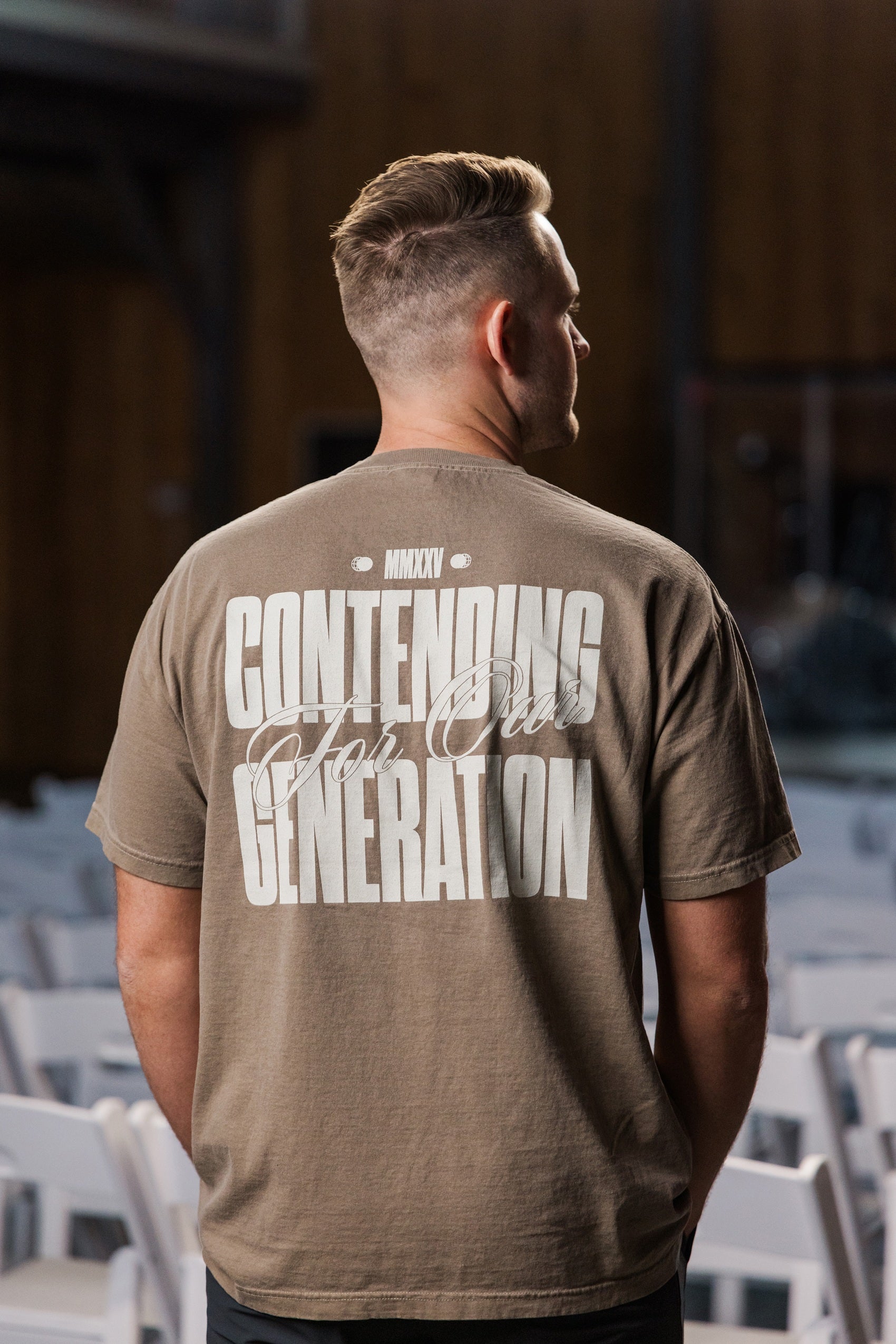 This Ignite Church t-shirt features a minimalist yet bold design. The front displays the church's name in sleek, modern typography, while the back carries an inspiring message: "Contending for Our Generation," emphasizing faith, dedication, and purpose. Made from a soft, neutral-toned fabric, this shirt is both stylish and comfortable—perfect for everyday wear or church events.